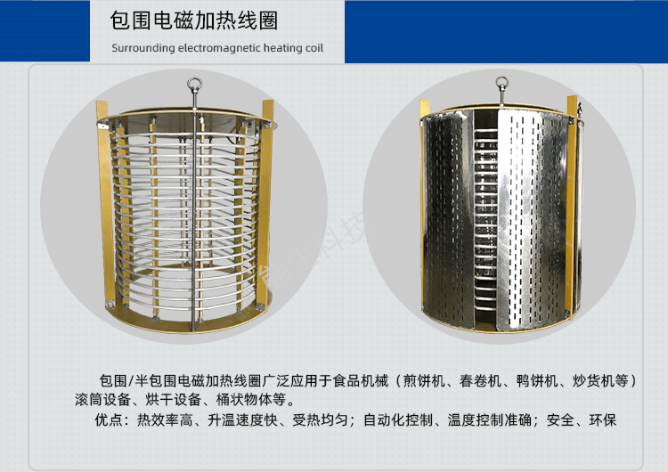包围电磁加热线圈:包围/半包围电磁加热线圈广泛应用于食品机械(煎饼机、春卷机、鸭饼机、炒货机等)滚筒设备、烘干设备、桶状物体等。优点:热效率高、升温速度快、受热均匀;自动化控制、温度控制准确;安全、环保.